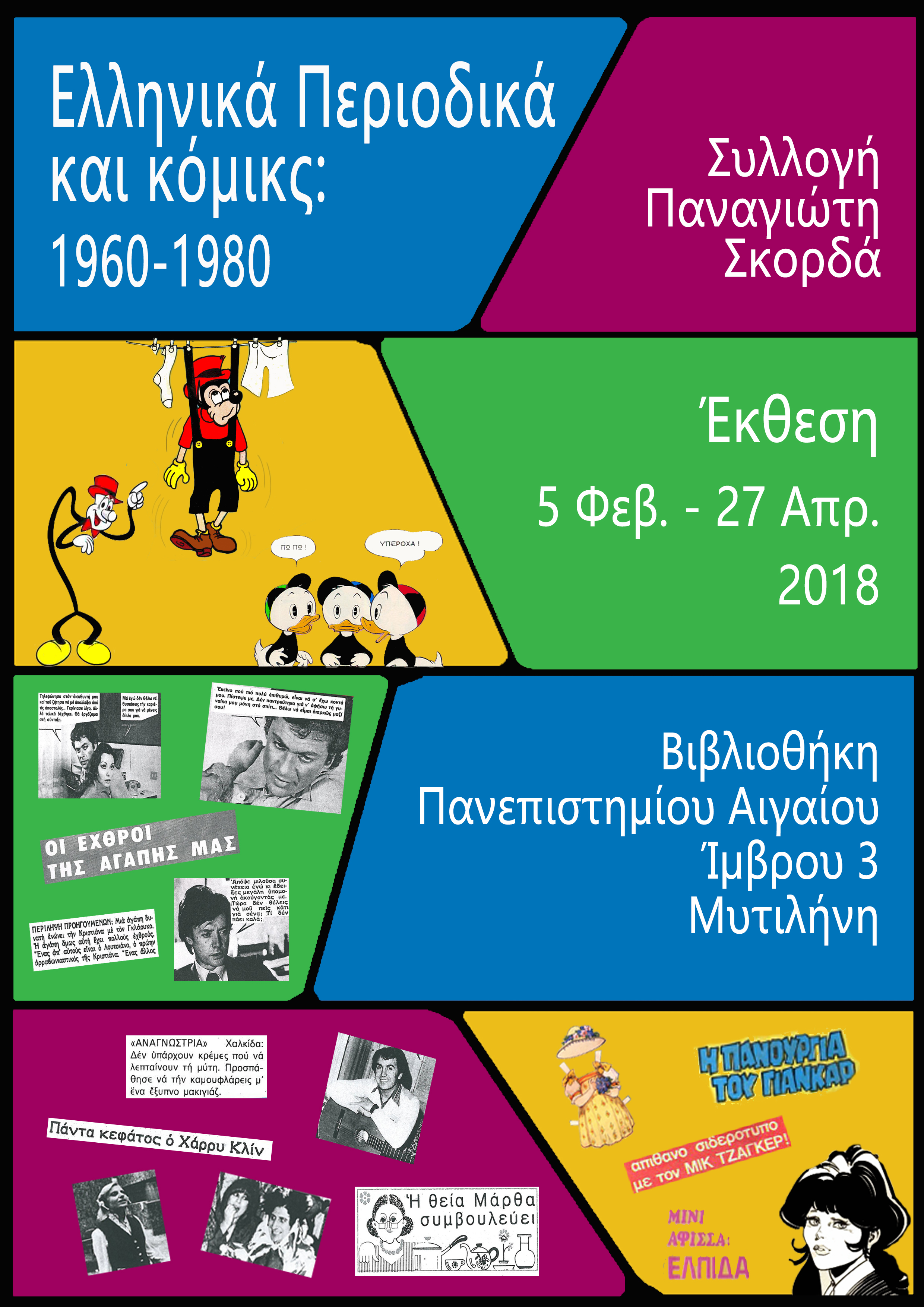Ο Γιώργος Θαλάσσης, η Κατερίνα και ο Σπίθας , ο Τζων Γκρηκ, ο Μπλεκ, ο Μικρός Καουμπόι, ο Μικρός Σερίφης, ο Γκαούρ Ταρζάν, ο Μπαγκς Μπάνυ, ο Μίκυ, η Μίνι, ο Ντόναλντ, ο Σεραφίνο, ο Ζαγκόρ, ο Φάντομ, ο Τιραμόλα, η Πάττυ και πολλοί ακόμη ήρωες των κόμικς «ζωντανεύουν» στην βιβλιοθήκη του Πανεπιστημίου Αιγαίου στη Μυτιλήνη με την ευκαιρία της έκθεσης «Περιοδικά και κόμικς τριών δεκαετιών 1960-1980» από τη συλλογή του φιλολόγου και Διευθυντή του 6ου Γυμνασίου Μυτιλήνης, Παναγιώτη Σκορδά.